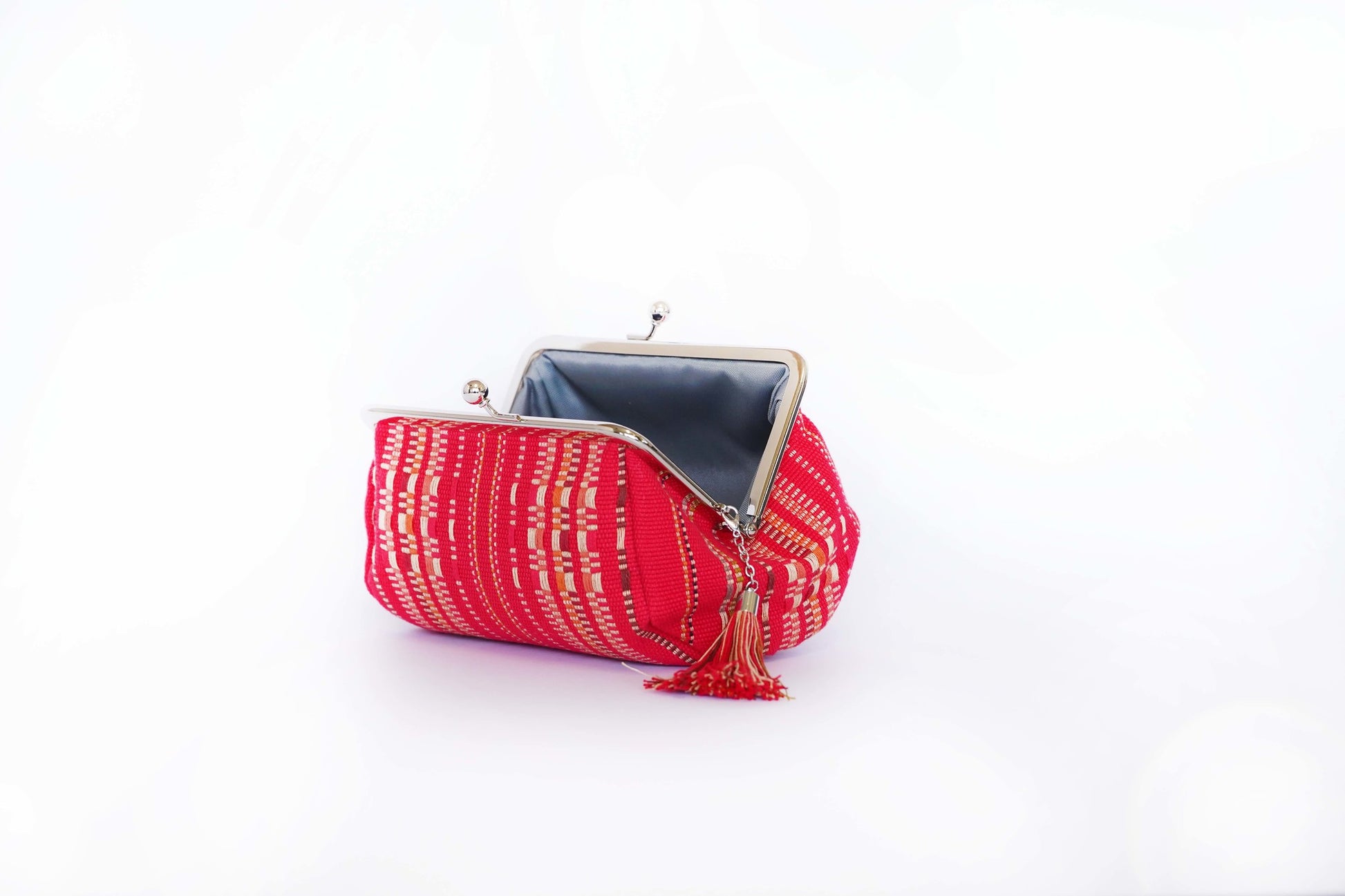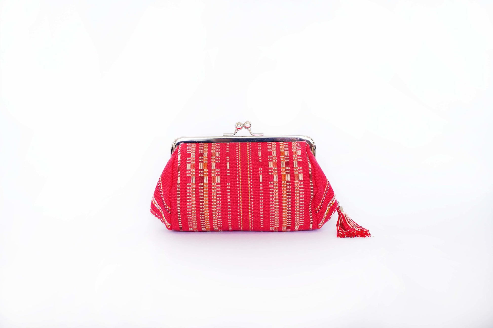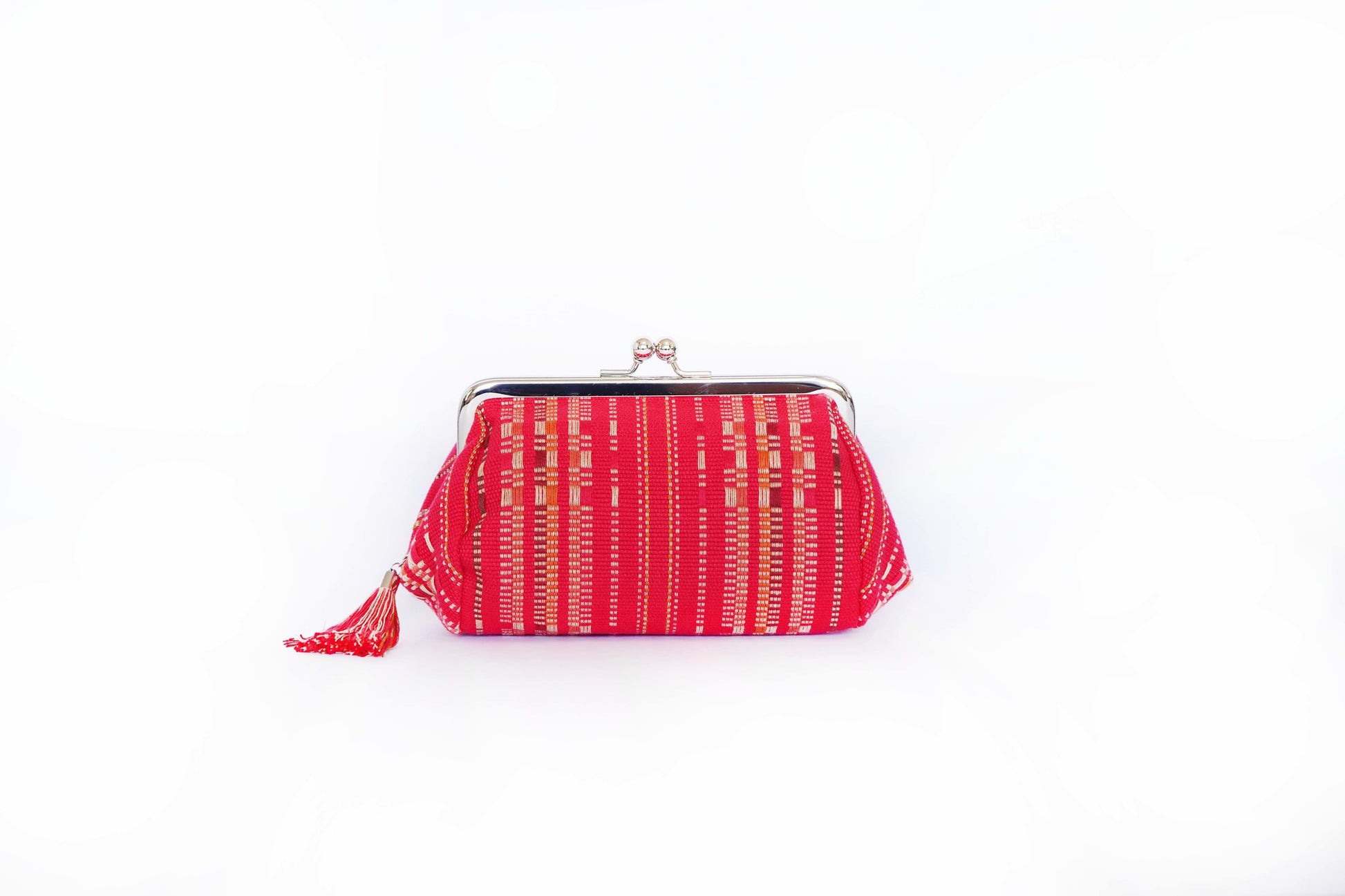 織物の素材は、天然の木綿糸を使用しており、肌触りが良く、通気性もありながらも本来はコースターやランチョンマットなど日常生活で使われるようにしっかりと織り込んでおり、快適な使い心地が特徴です。職人の手仕事ならではの、独特な風合いや織り目が、ポーチにあたたかみを与えます。